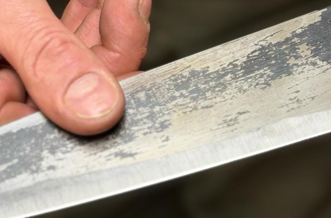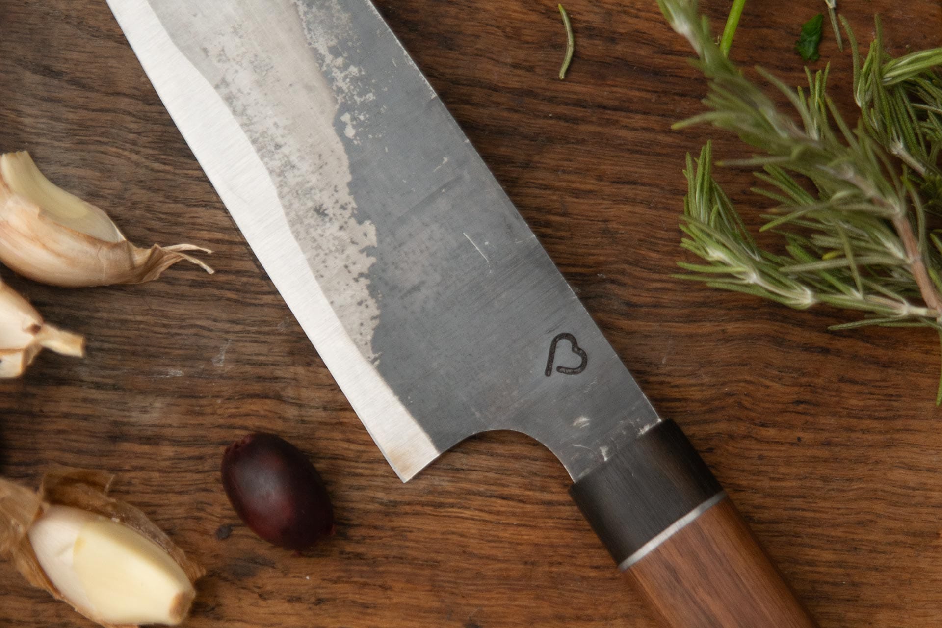 Jedes Messer ein Unikat: Der L2-Kohlenstoffstahl erhält durch das Einbrennen im Öl eine markante, tiefschwarze Patina, die gleichzeitig als natürlicher Korrosionsschutz dient.