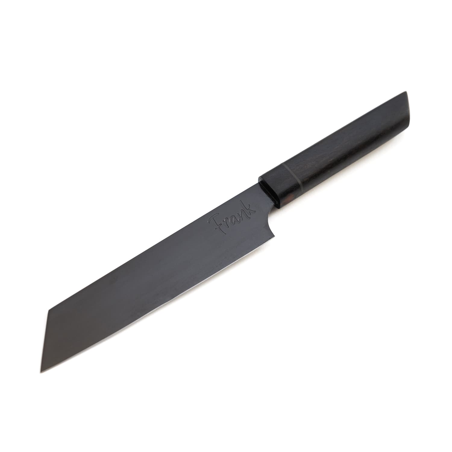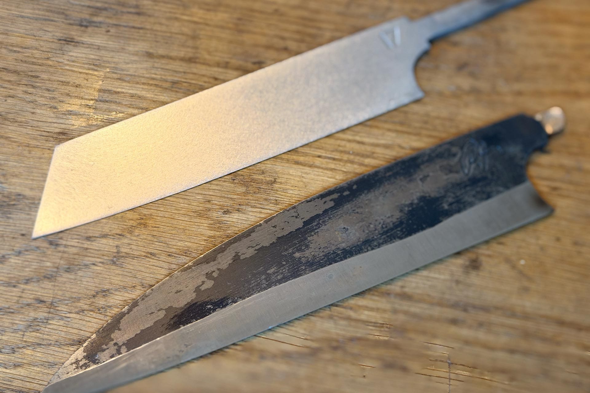 Nach dem Härten kann die Klinge direkt aus dem Öl übernommen werden. Die natürliche Schwärzung und Oberfläche erzeugen einen rohen, lebendigen Look mit ausgeprägtem handwerklichem Ausdruck.
