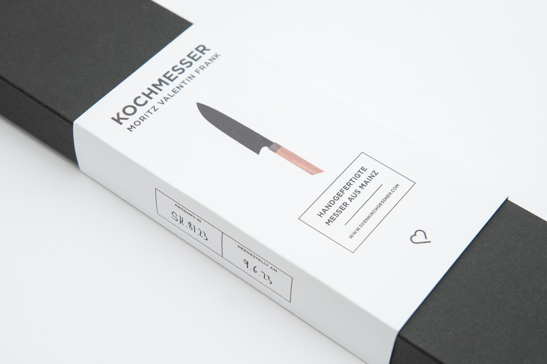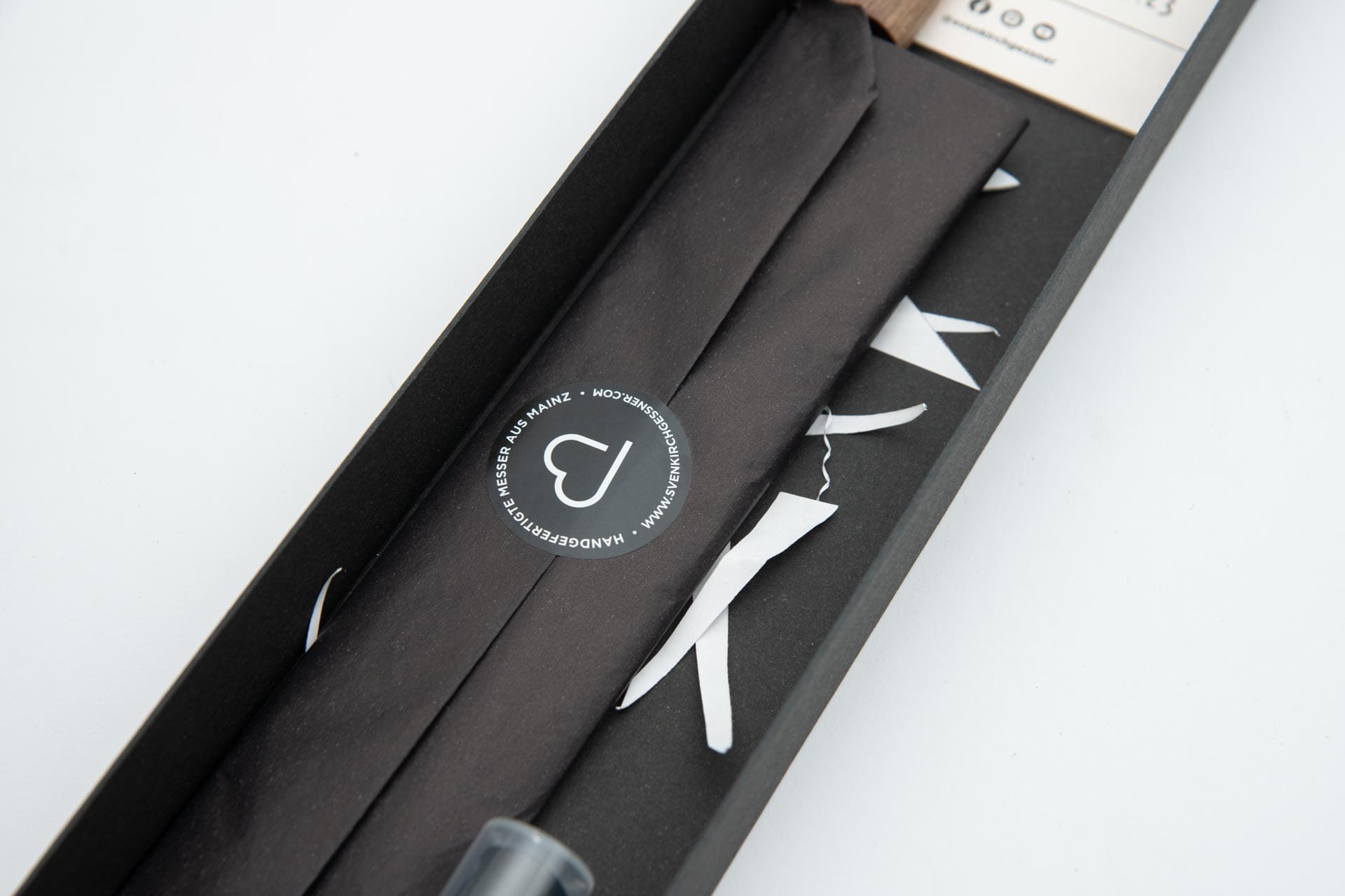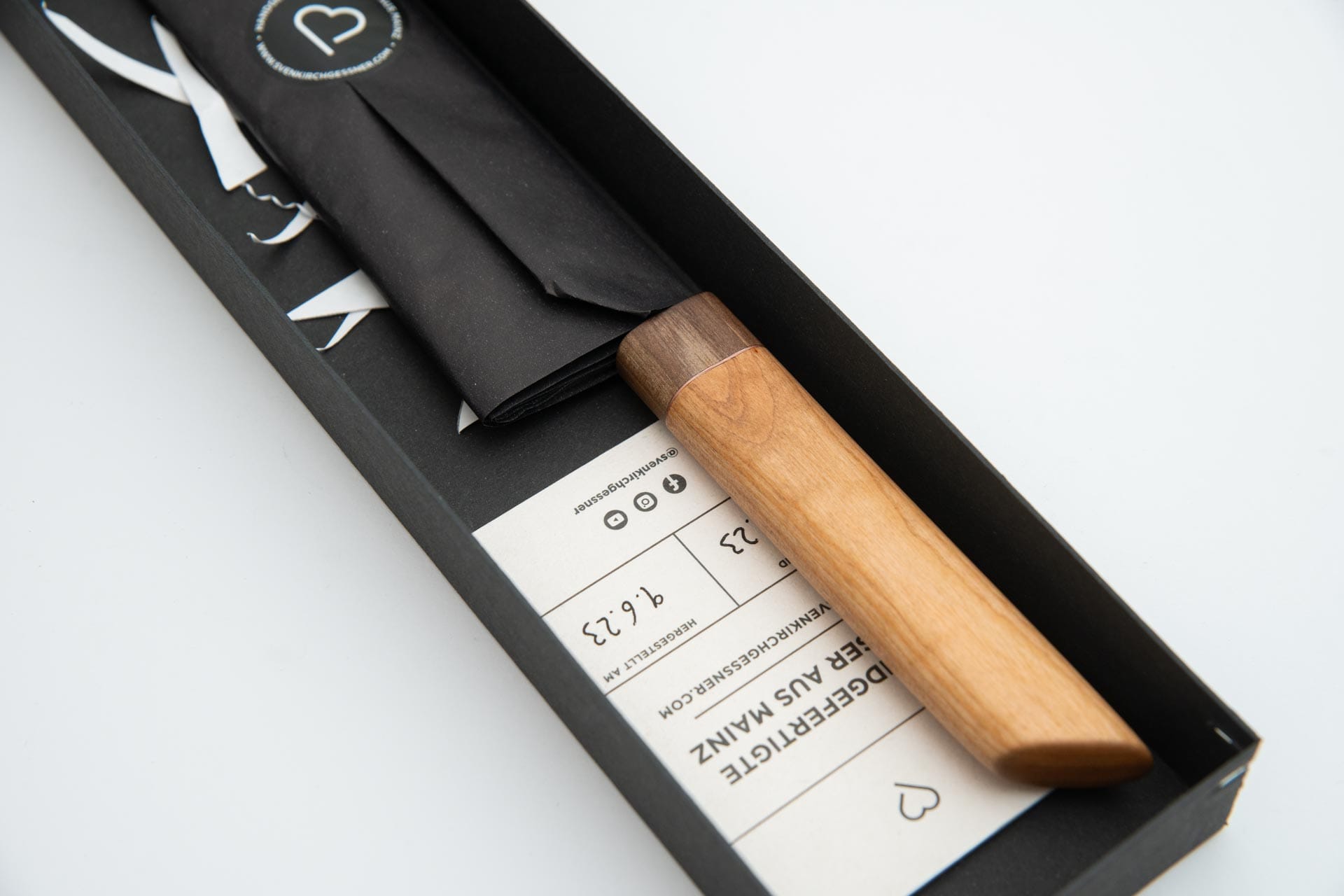 Ein besonderes Messer verdient einen würdigen Rahmen: Jedes Stück verlässt meine Werkstatt in einer sachgerechten Box mit individueller Banderole. Die Verpackung wird der Sache an sich gerecht – sie schützt nicht nur, sondern zelebriert den Moment des Auspackens. Für den dauerhaften Erhalt liegen jeder Box ein Klingenschutz aus Papier sowie hochwertiges Kamelienöl bei.
