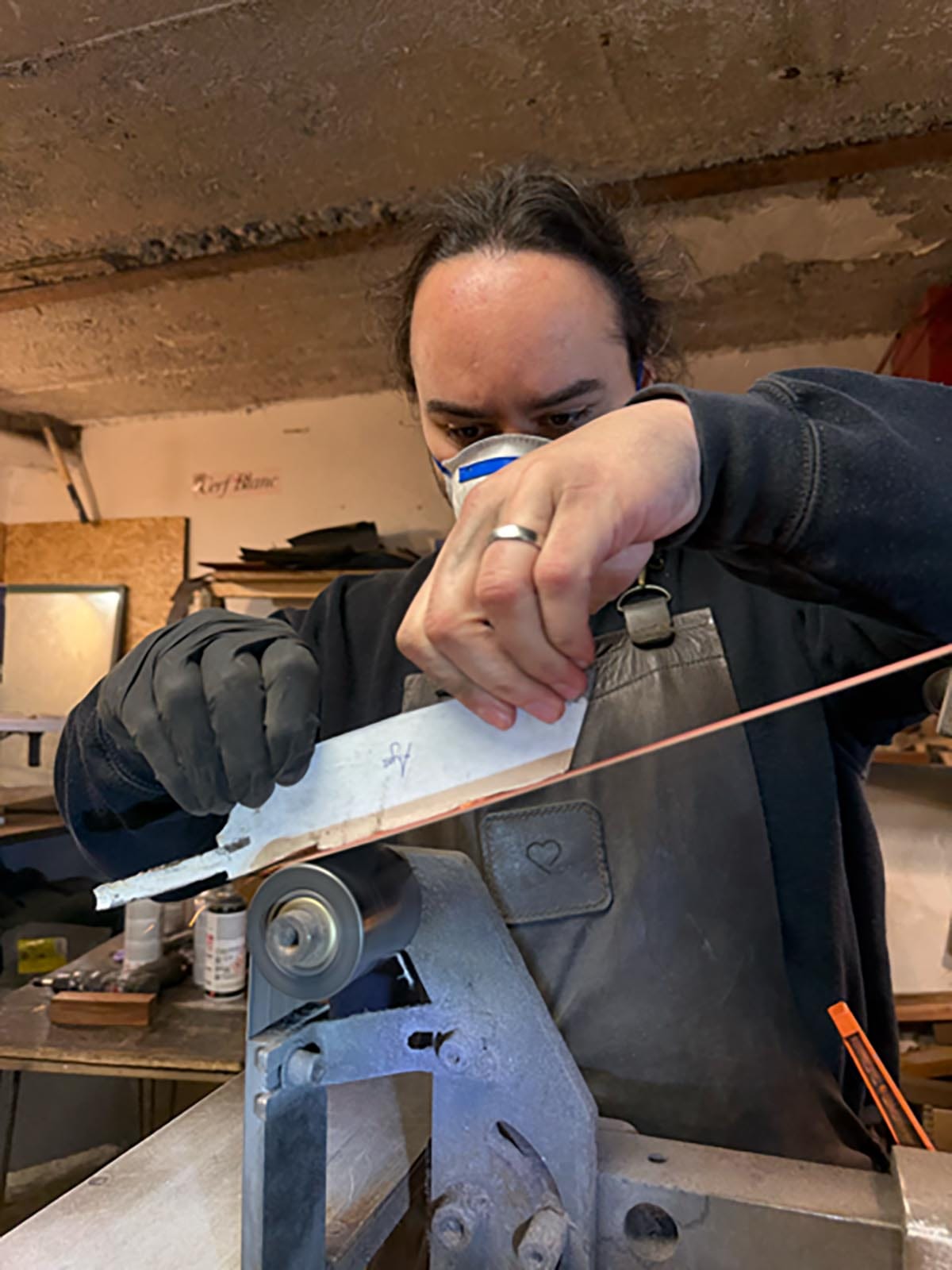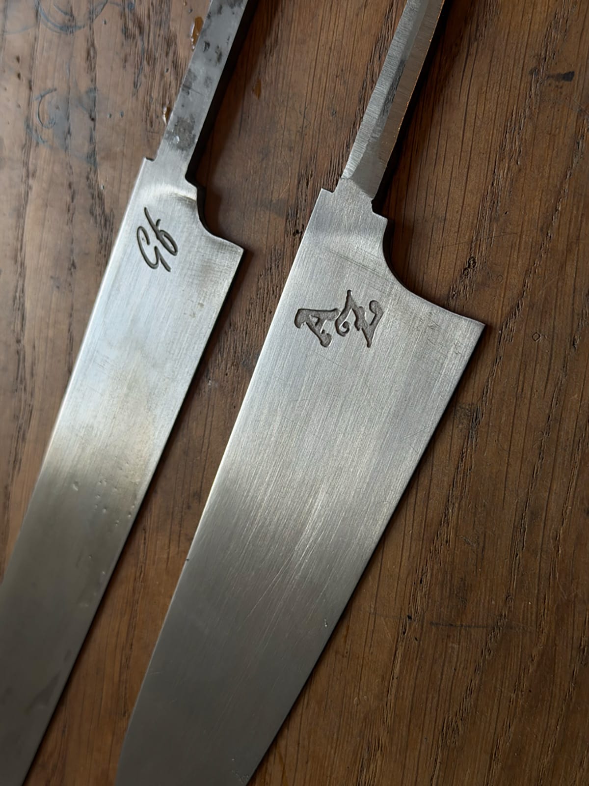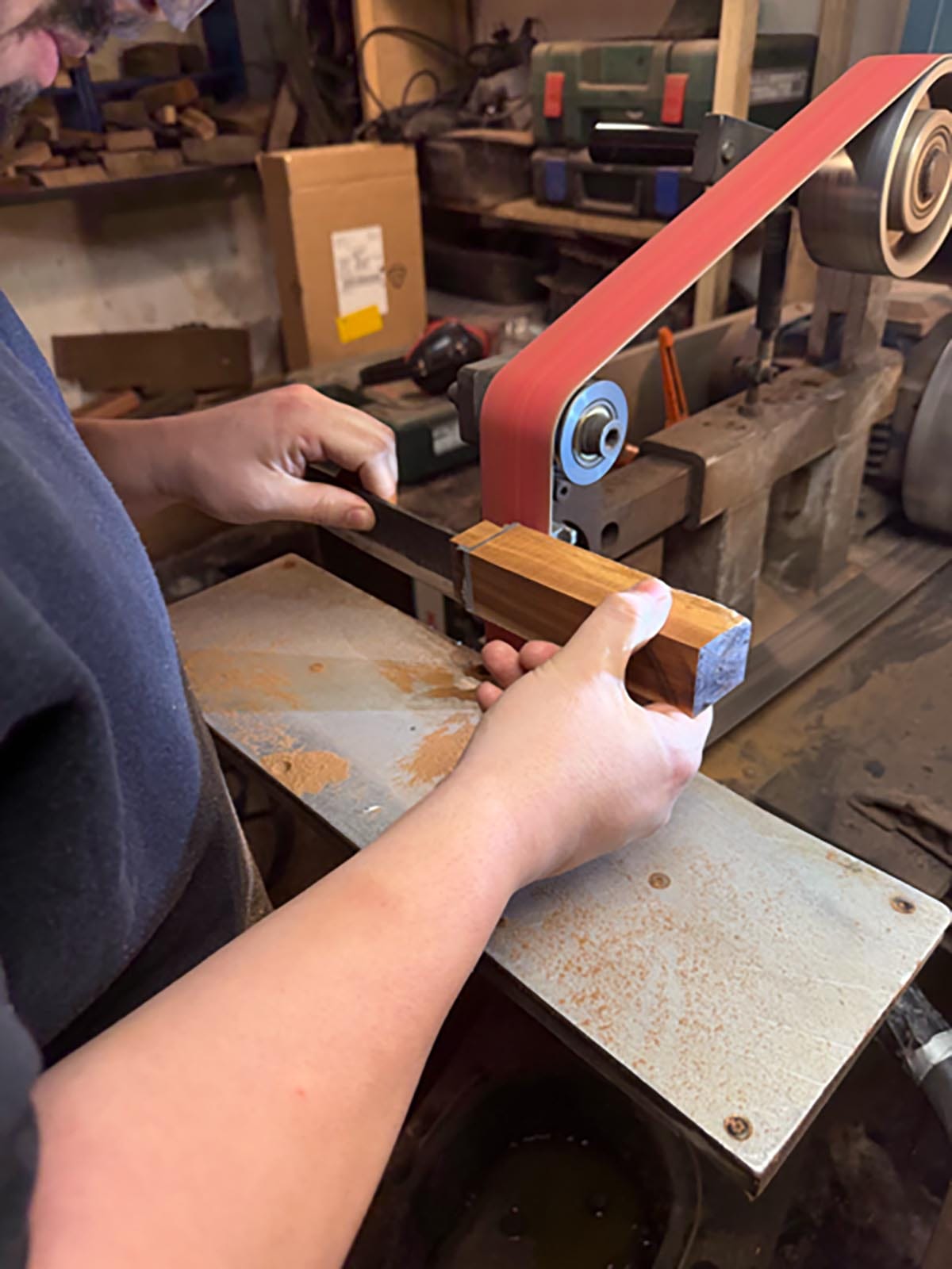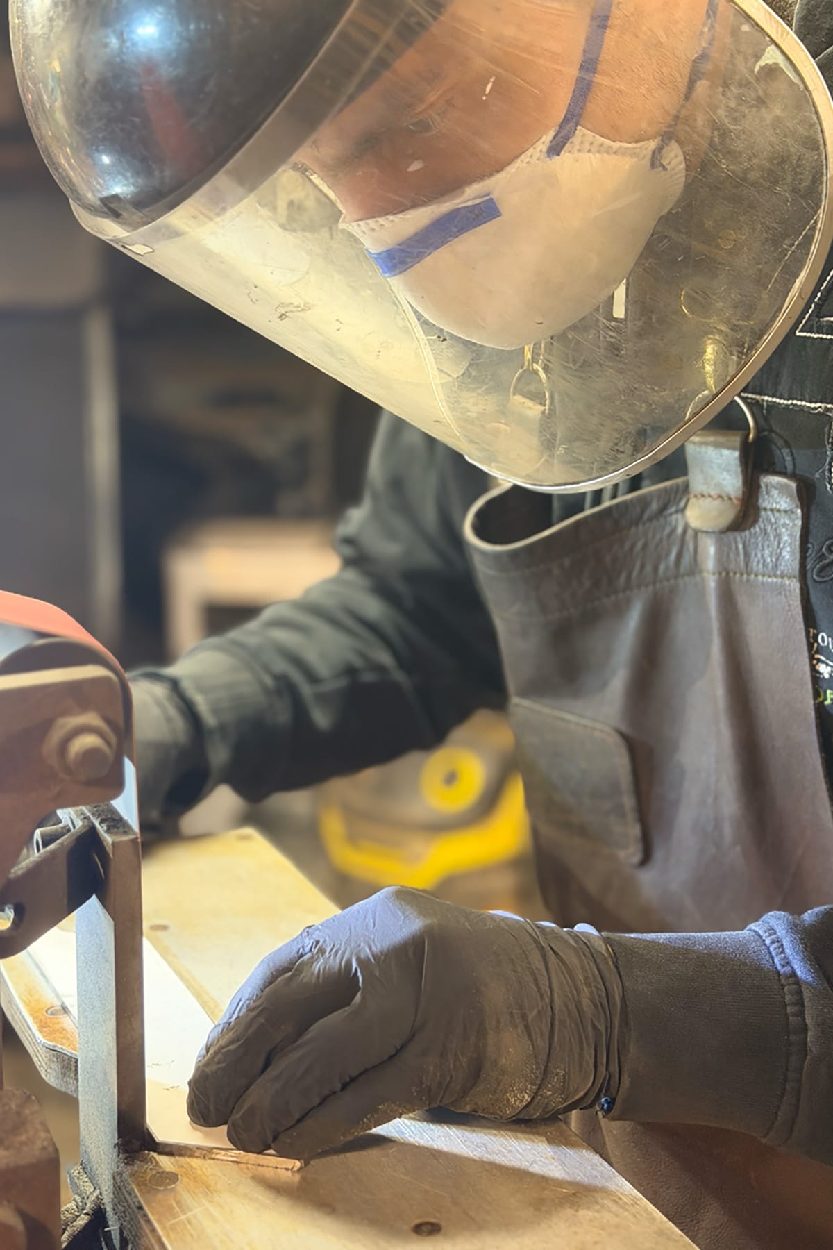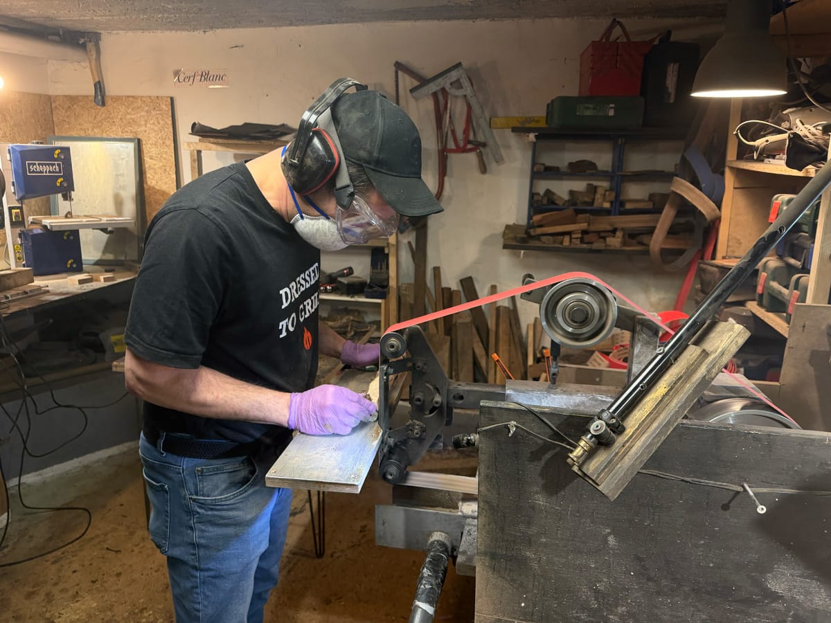 Du arbeitest an deiner eigenen Klinge: vom Rohstahl bis zum präzisen Schliff, vom Oberflächenfinish bis zu optionalen Ätzungen mit persönlicher Bedeutung. Auch der Griff wird nicht vorgegeben, sondern bewusst gewählt. Holz und Material, Form, Haptik und Balance fügen sich zu einem Messer, das sich natürlich anfühlt und eindeutig dir gehört.