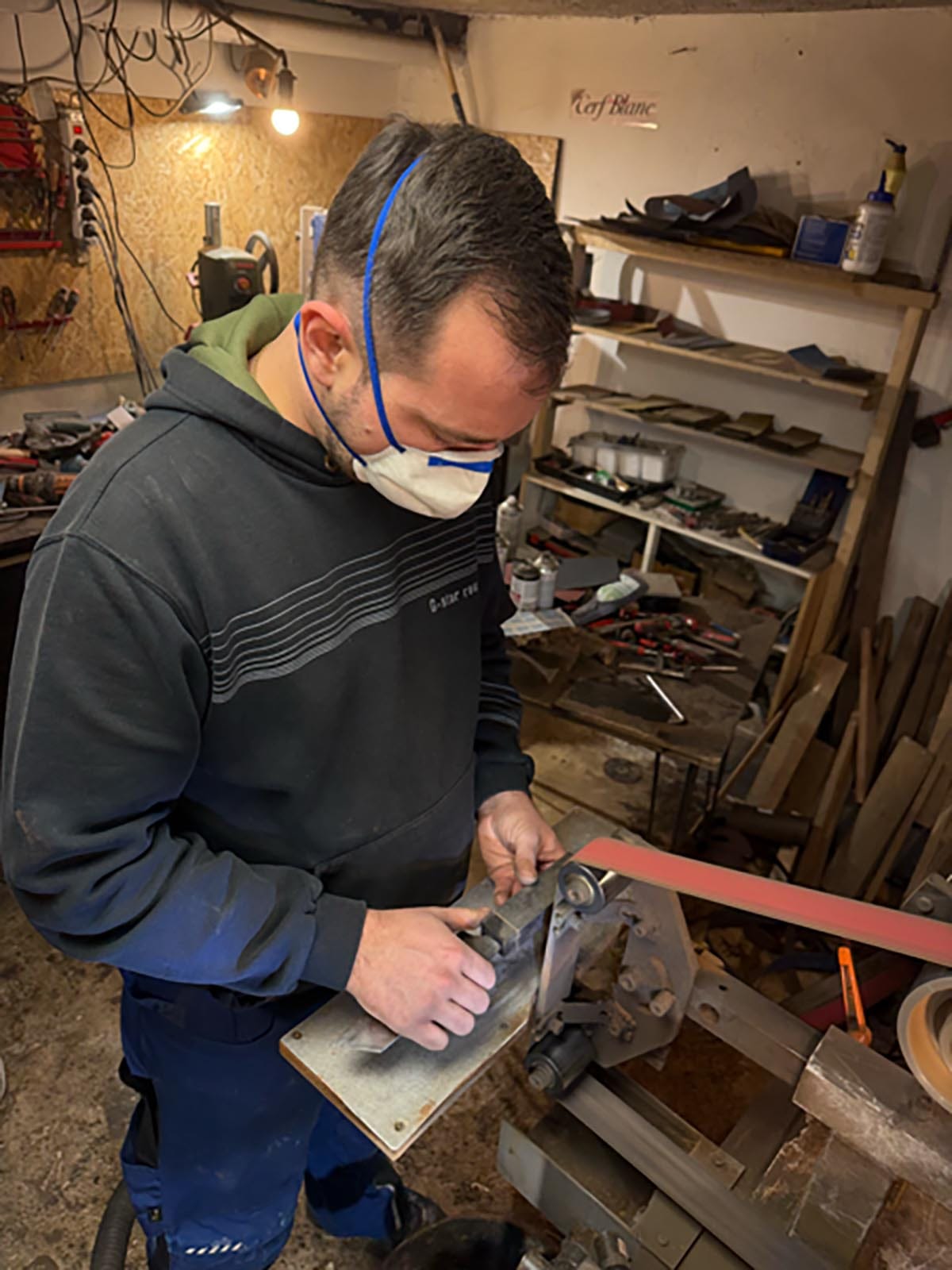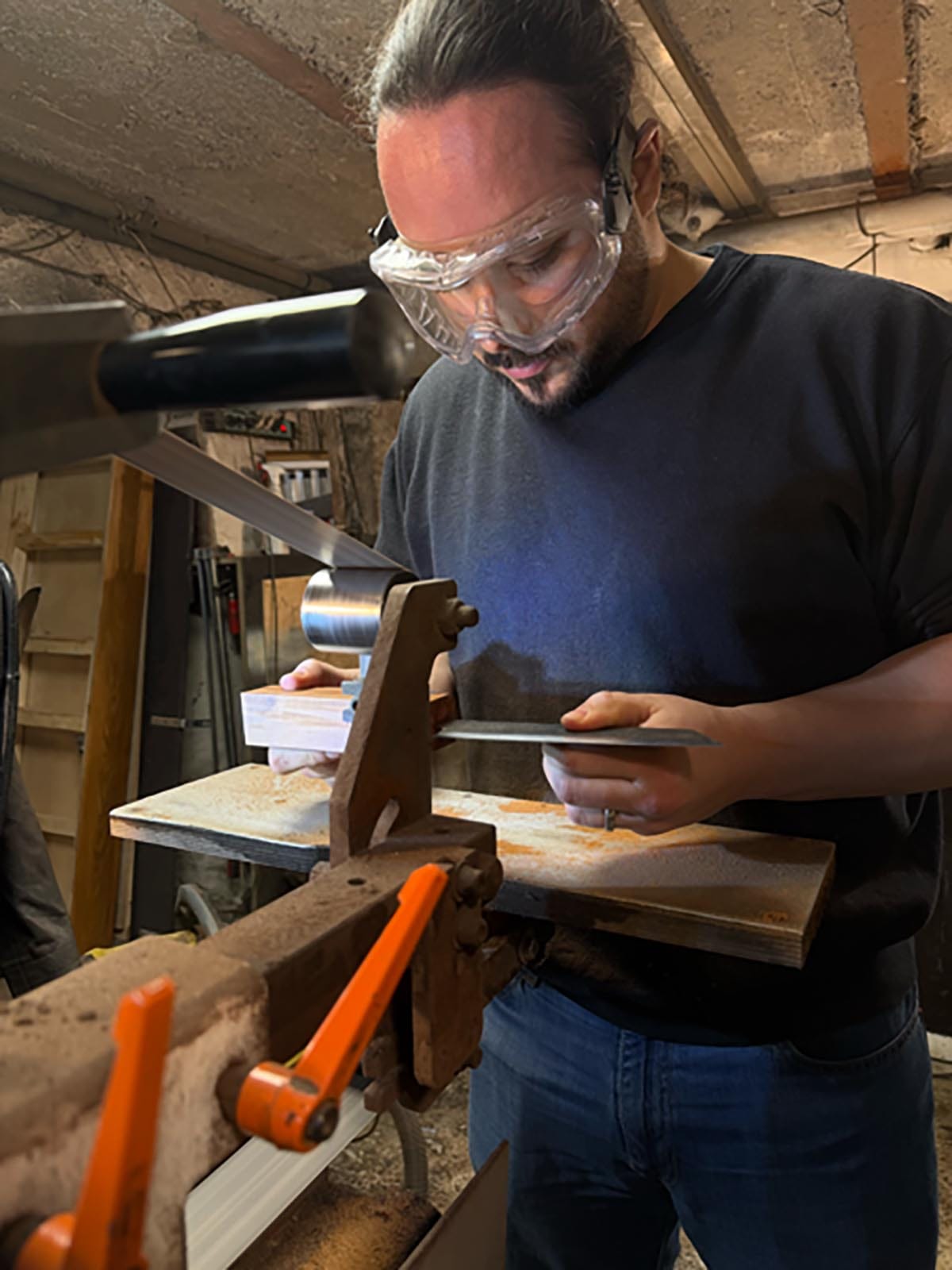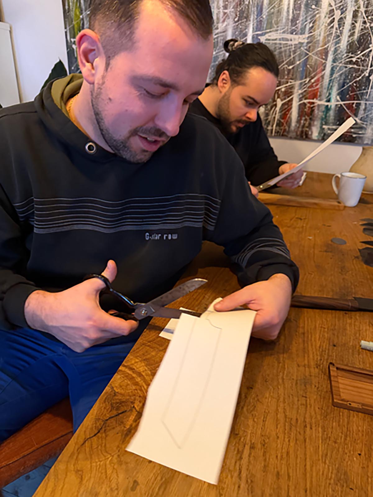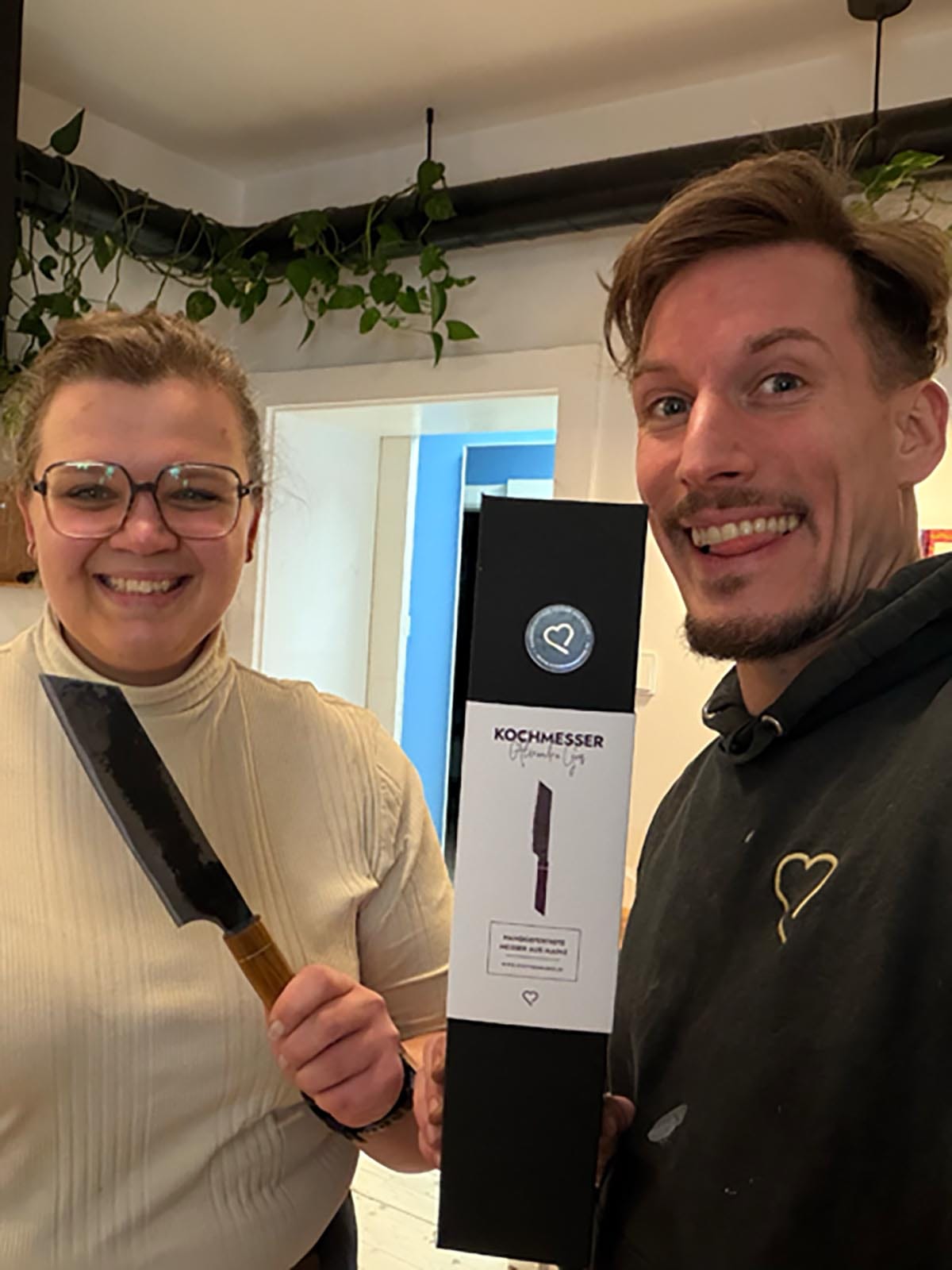 Du arbeitest an deiner eigenen Klinge: vom Rohstahl bis zum präzisen Schliff, vom Oberflächenfinish bis zu optionalen Ätzungen mit persönlicher Bedeutung. Auch der Griff wird nicht vorgegeben, sondern bewusst gewählt. Holz und Material, Form, Haptik und Balance fügen sich zu einem Messer, das sich natürlich anfühlt und eindeutig dir gehört.