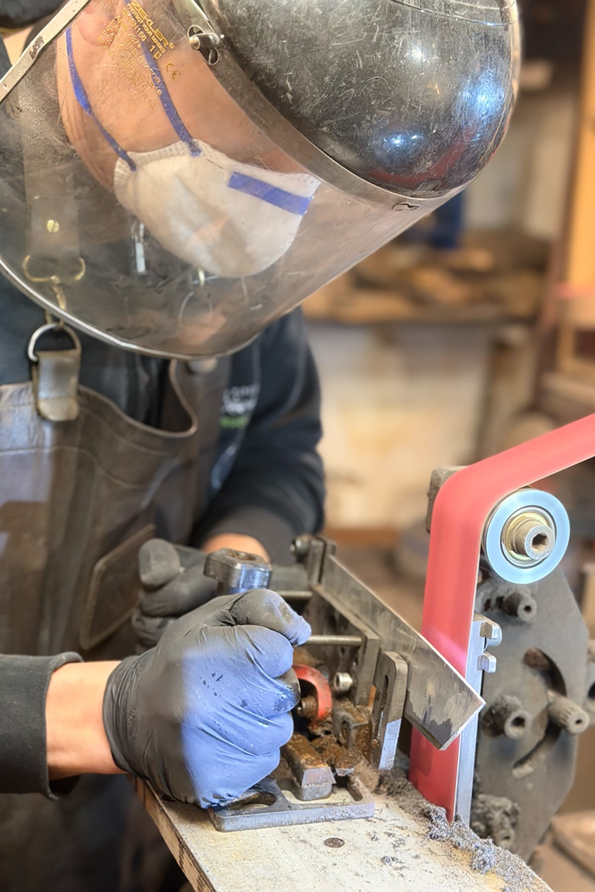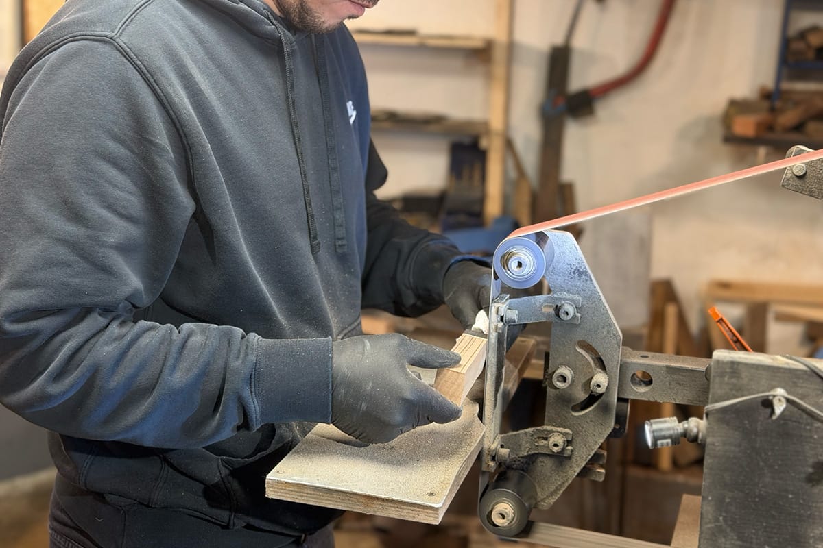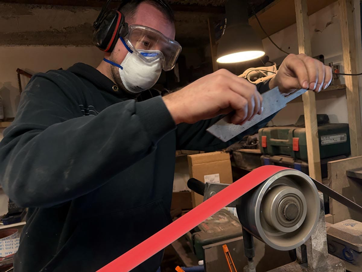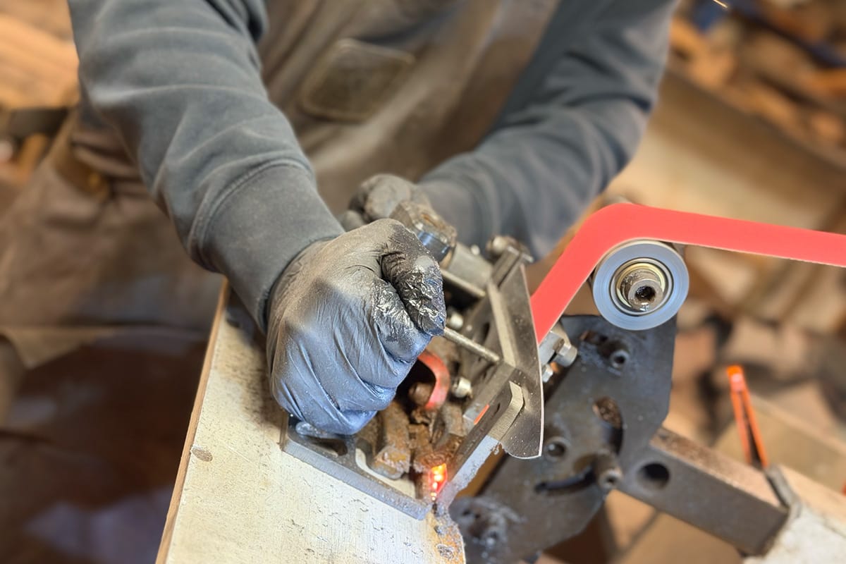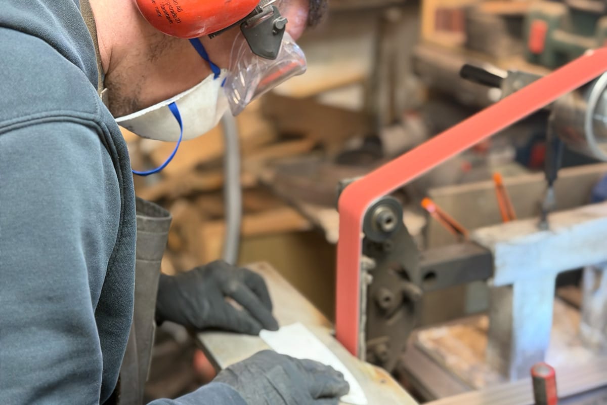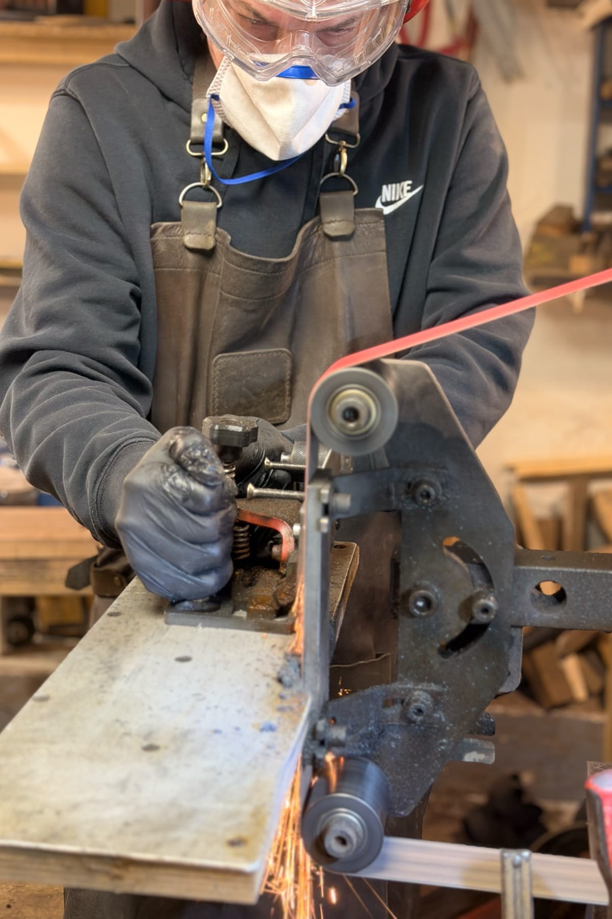 Jetzt wird es präzise. Am Schleifband definierst du die Geometrie der Klinge. Schritt für Schritt arbeitest du dich an den perfekten Winkel heran. Es ist ein Prozess der Konzentration, bei dem du das Zusammenspiel von Materialabtrag und Formgebung unmittelbar erlebst. Ein guter Schliff entscheidet später über die Performance in der Küche.