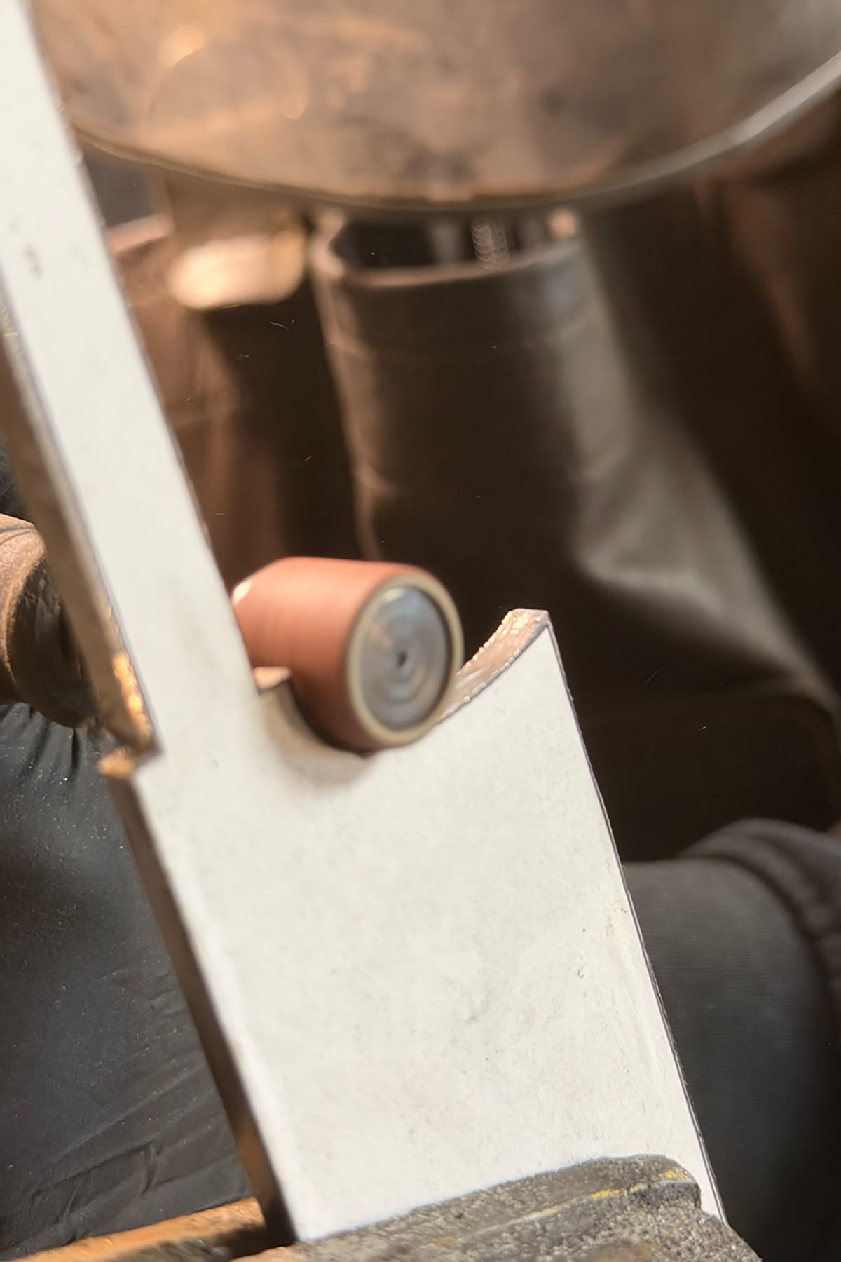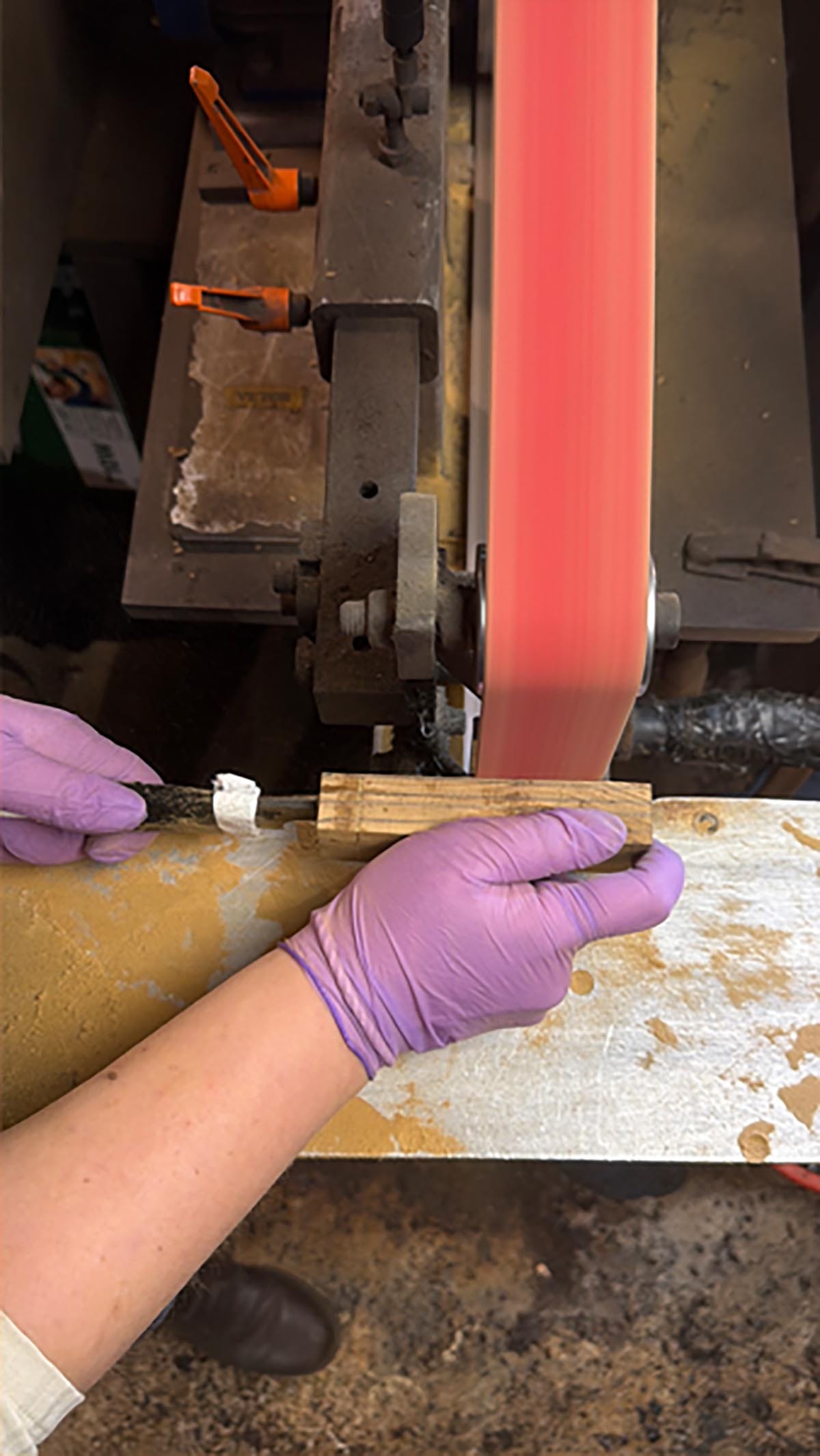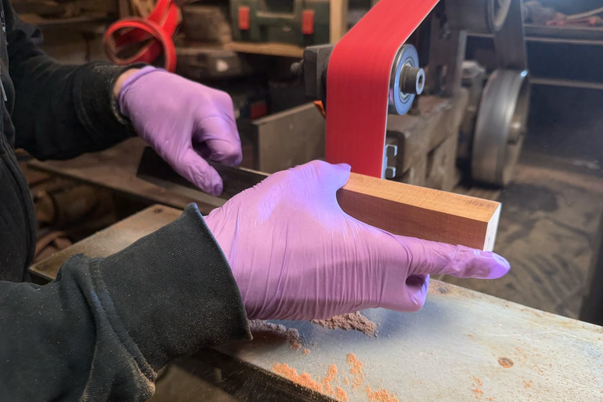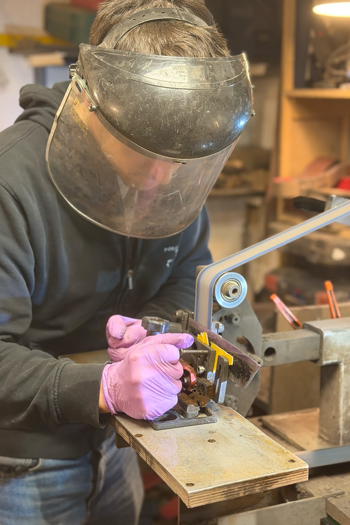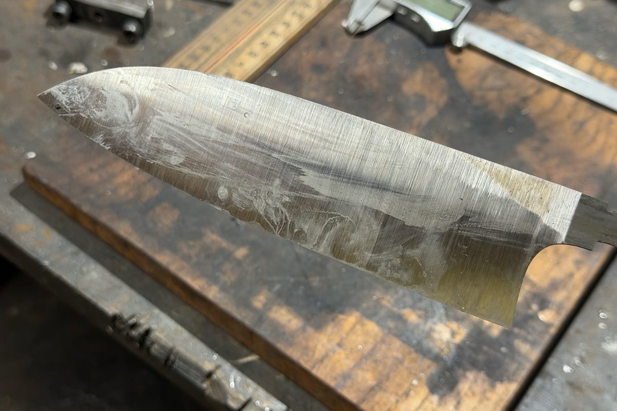 Jetzt wird es präzise. Am Schleifband definierst du die Geometrie der Klinge. Schritt für Schritt arbeitest du dich an den perfekten Winkel heran. Es ist ein Prozess der Konzentration, bei dem du das Zusammenspiel von Materialabtrag und Formgebung unmittelbar erlebst. Ein guter Schliff entscheidet später über die Performance in der Küche.