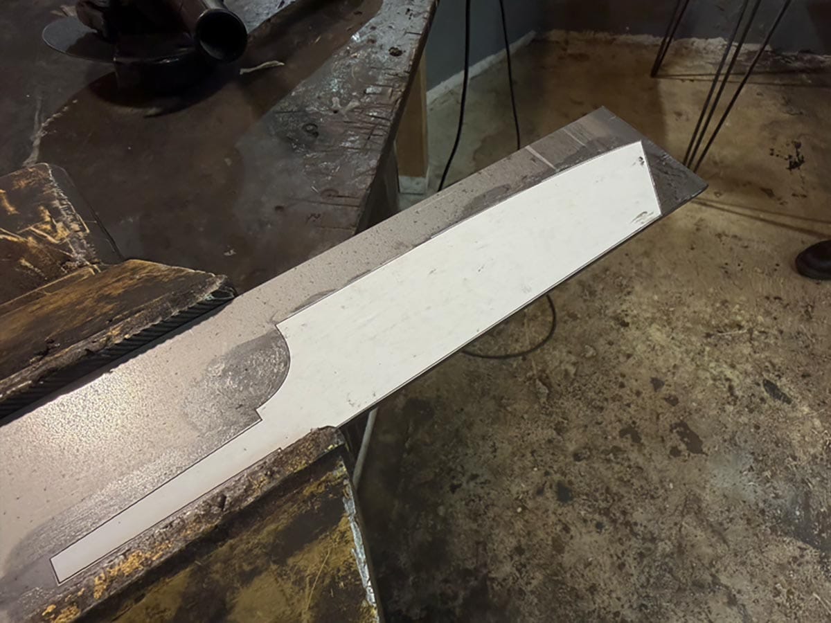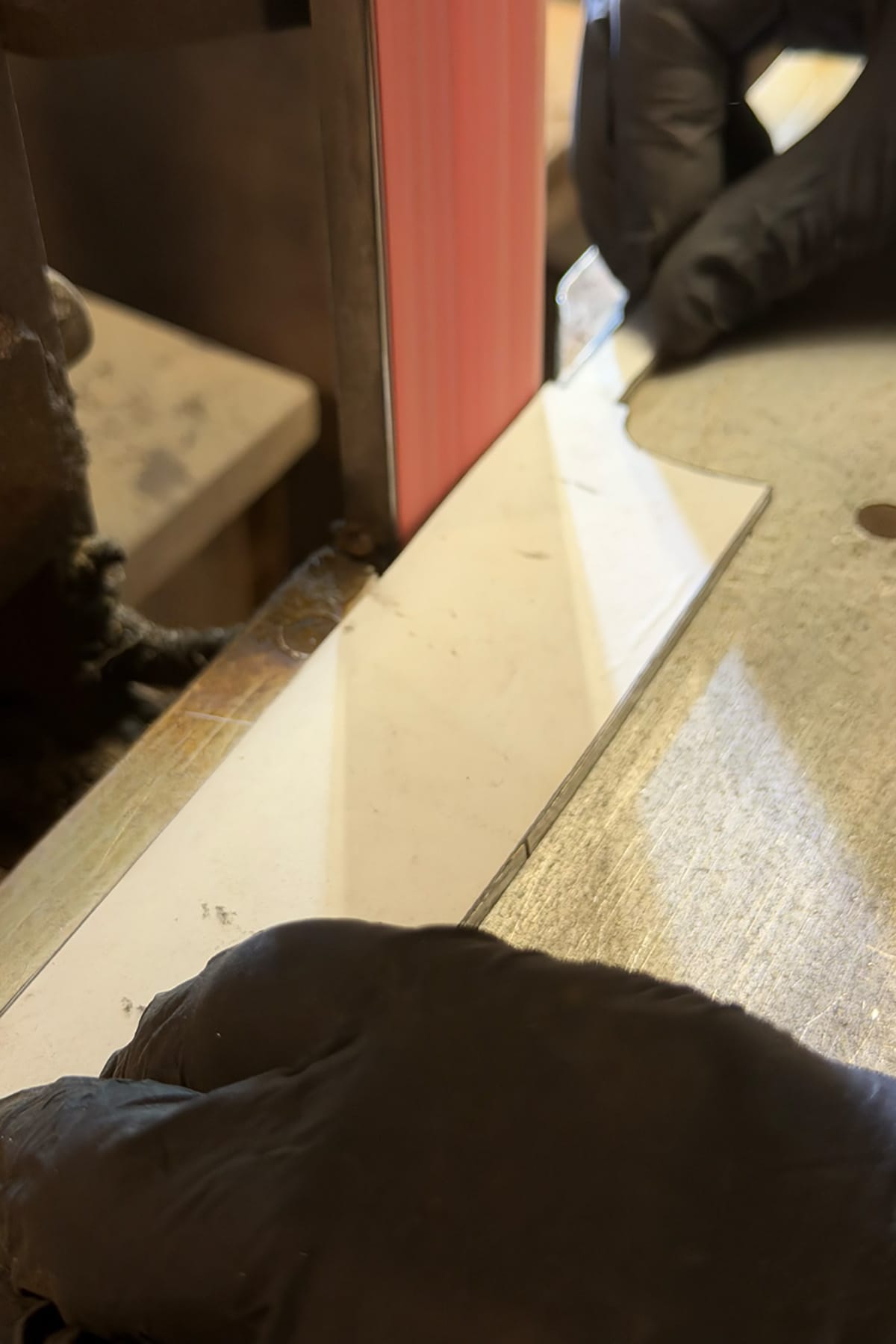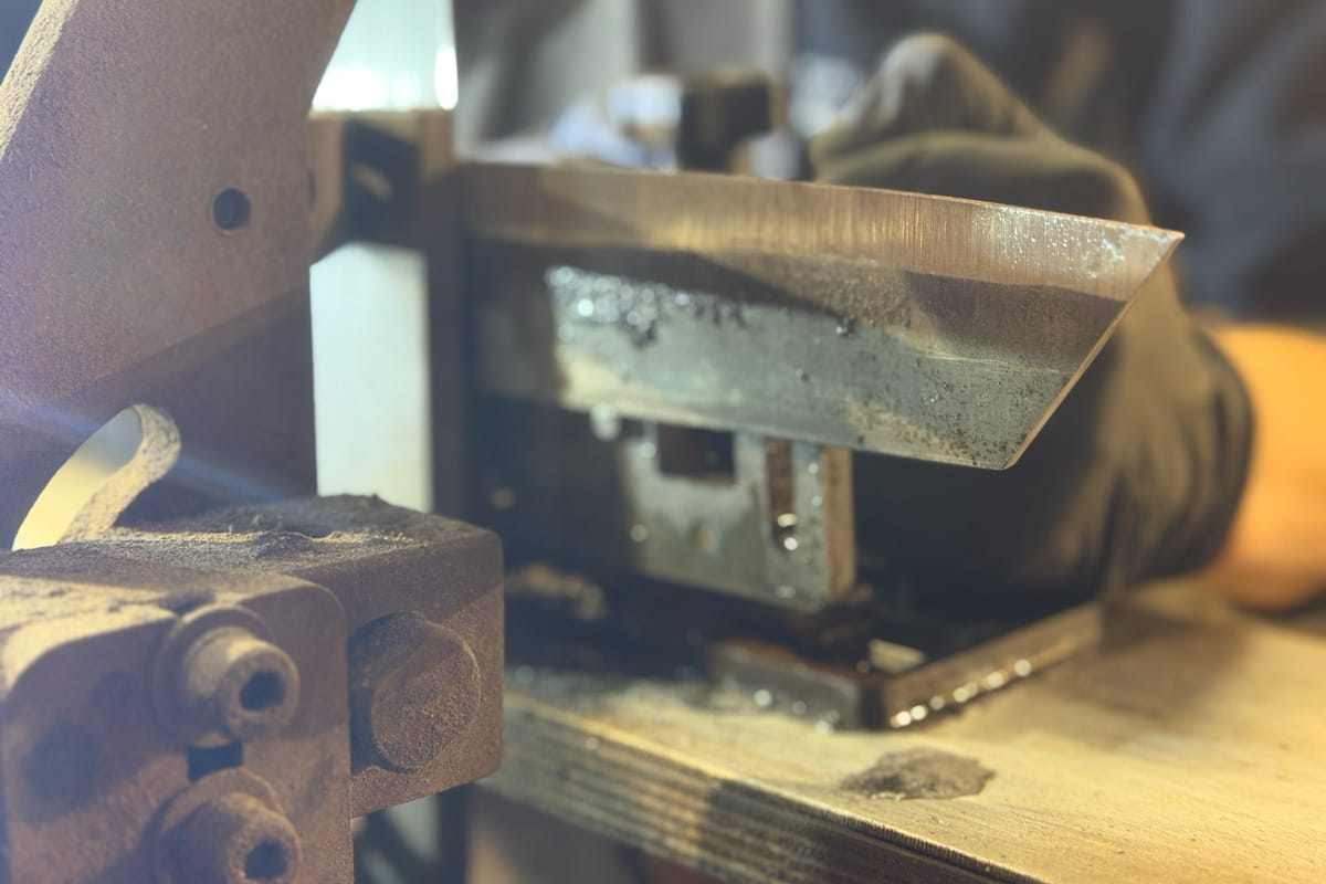 Aus einem unscheinbaren Stück Flachstahl entsteht die erste physische Form. Du schneidest die Kontur deiner Klinge aus dem Rohstahl. Es ist der Moment, in dem aus deiner Idee ein greifbares Objekt wird. Hier entscheiden wir über die Linienführung, die Balance und den Charakter des Messers.