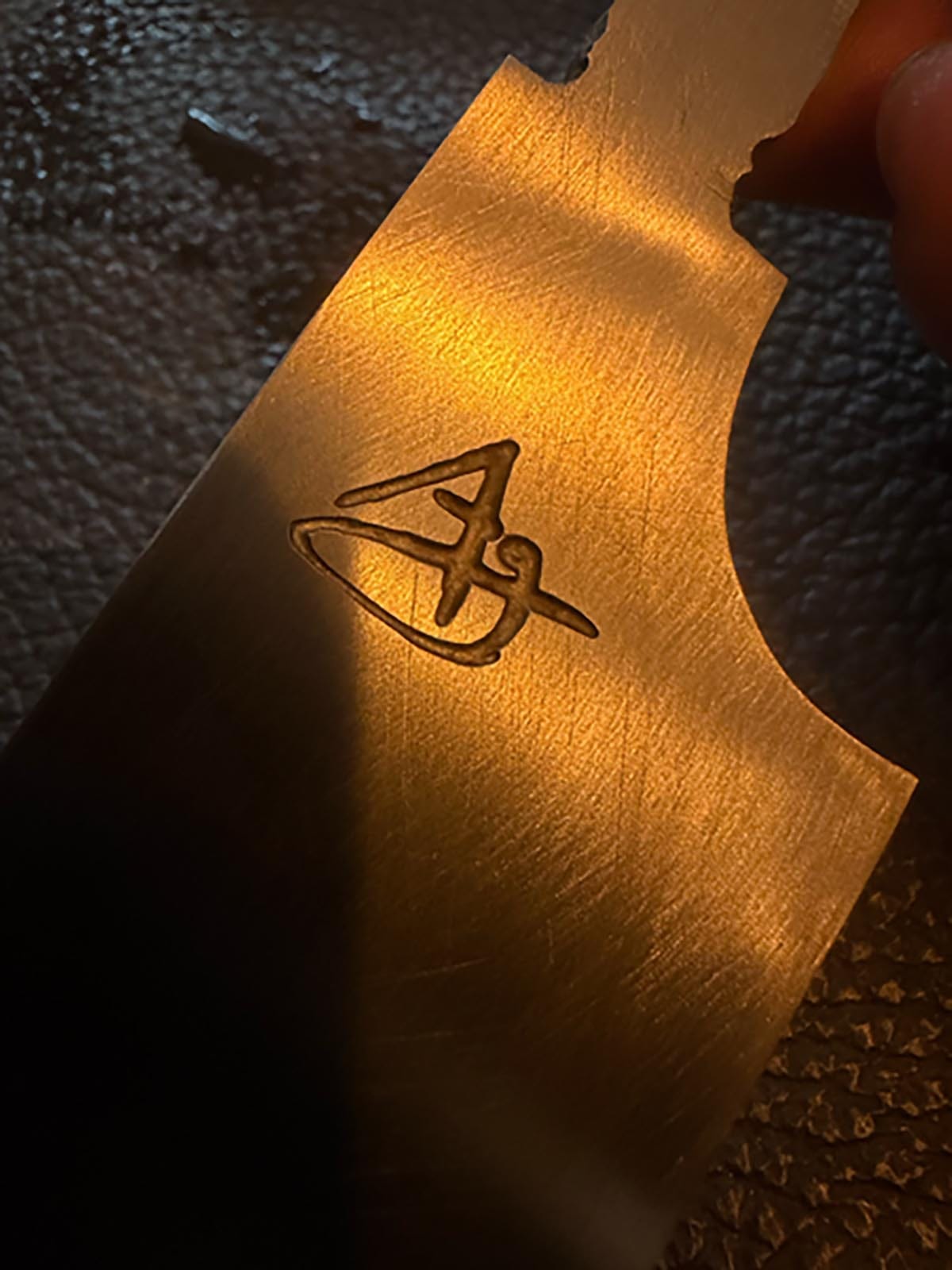 Durch gezielte Ätzverfahren verleihen wir der Klinge ihre ganz persönliche Identität. Ob markante Muster, Initialen oder Symbole mit tieferer Bedeutung – hier wird das Messer zu deiner Leinwand. Die Ätzung ist weit mehr als nur Dekoration; sie gibt dem Stahl eine Geschichte und eine unverwechselbare Textur, die dein Messer zu einem echten Einzelstück macht, das es so kein zweites Mal gibt.